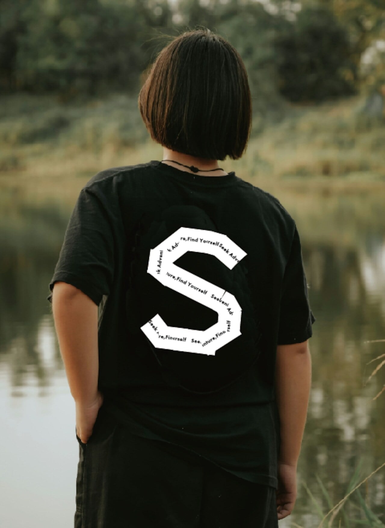 大胆な「S」バックプリントと、“Seek Adventure, Find Yourself” のメッセージ。日常の冒険心をそっと後押ししてくれる、そんな一枚です。