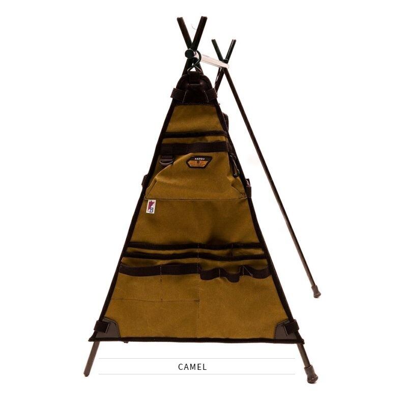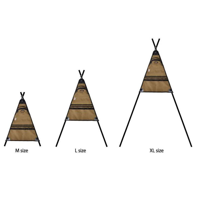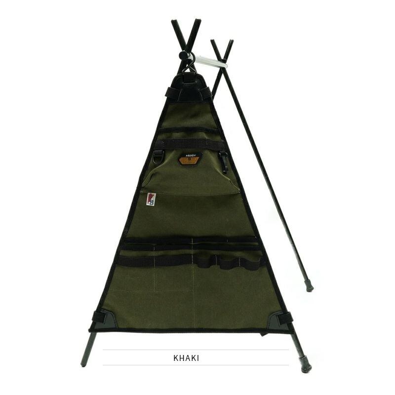 焚き火の火の粉などが当たっても燃え広がりにくく、インディアンハンガーのサイドポケットとして、キッチン周りの用具やガストーチ、手袋などを収納することが出来ます。